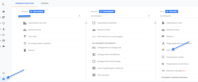 Quindi fai clic sull’icona a forma di ingranaggio “Amministratore” su Google Analytics e fai clic sul link “Filtri”.